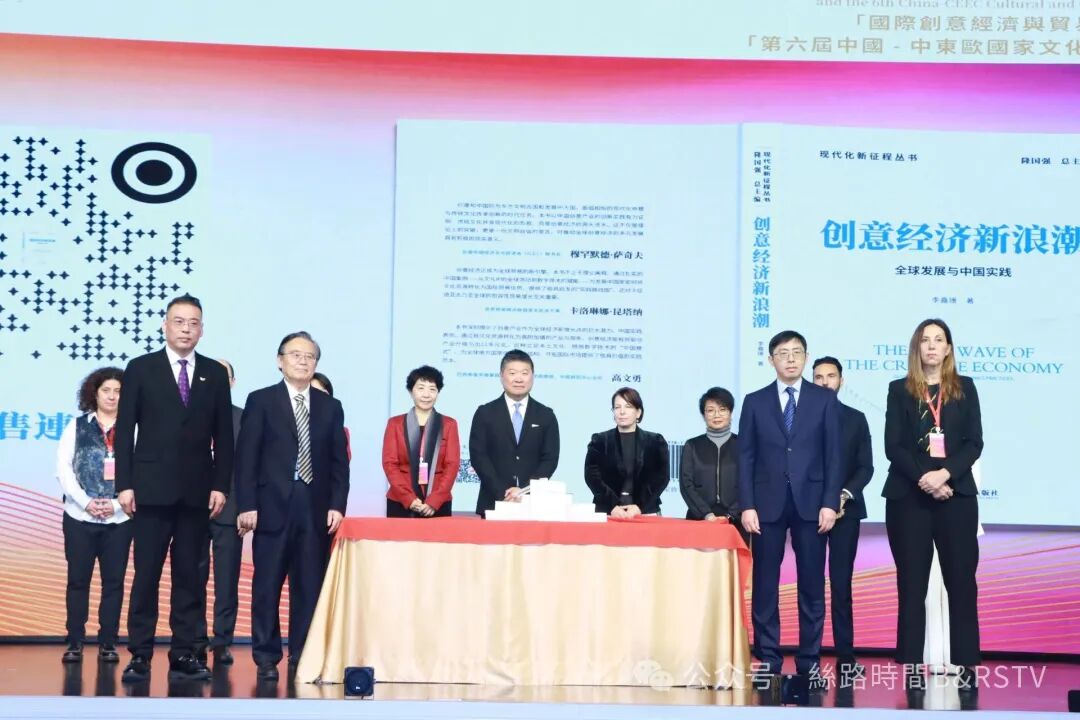在中国人民大学教授、文化创意产业研究所所长金元浦,北京第二外国语学院科研处处长李洪波,丝路卫视台长、国际创意经济贸易组织理事长程相逢,塞尔维亚国家创意平台国际关系高级顾问伊万娜·泽切维奇共同见证下,学术著作《创意经济新浪潮—全球发展与中国实践》新书发布。