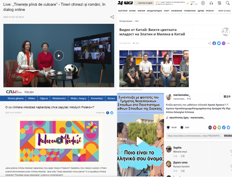 文学、历史、艺术、双边交往......活动期间组织的多场“青年云对话”让中外青年们围绕共同关注的话题深入探讨,收获满满。来自中国和罗马尼亚的近百名高校师生分享了学习汉语、罗马尼亚语的经历,展示了歌舞、朗诵等才艺,并畅谈了对双方国家历史、文化的理解。在华保加利亚留学生做客总台演播室,与保加利亚语主播畅谈他们做冬奥志愿者、练习武术、录制综艺节目等丰富的经历和体验,保加利亚“24小时”网站、保加利亚“观察”网等平台对节目进行播发,覆盖人口600万。活动还以街头采访、互问互答等方式推出《中波青年系列问答》《采访上外师生—说希腊语的中国人们》等多语种节目。