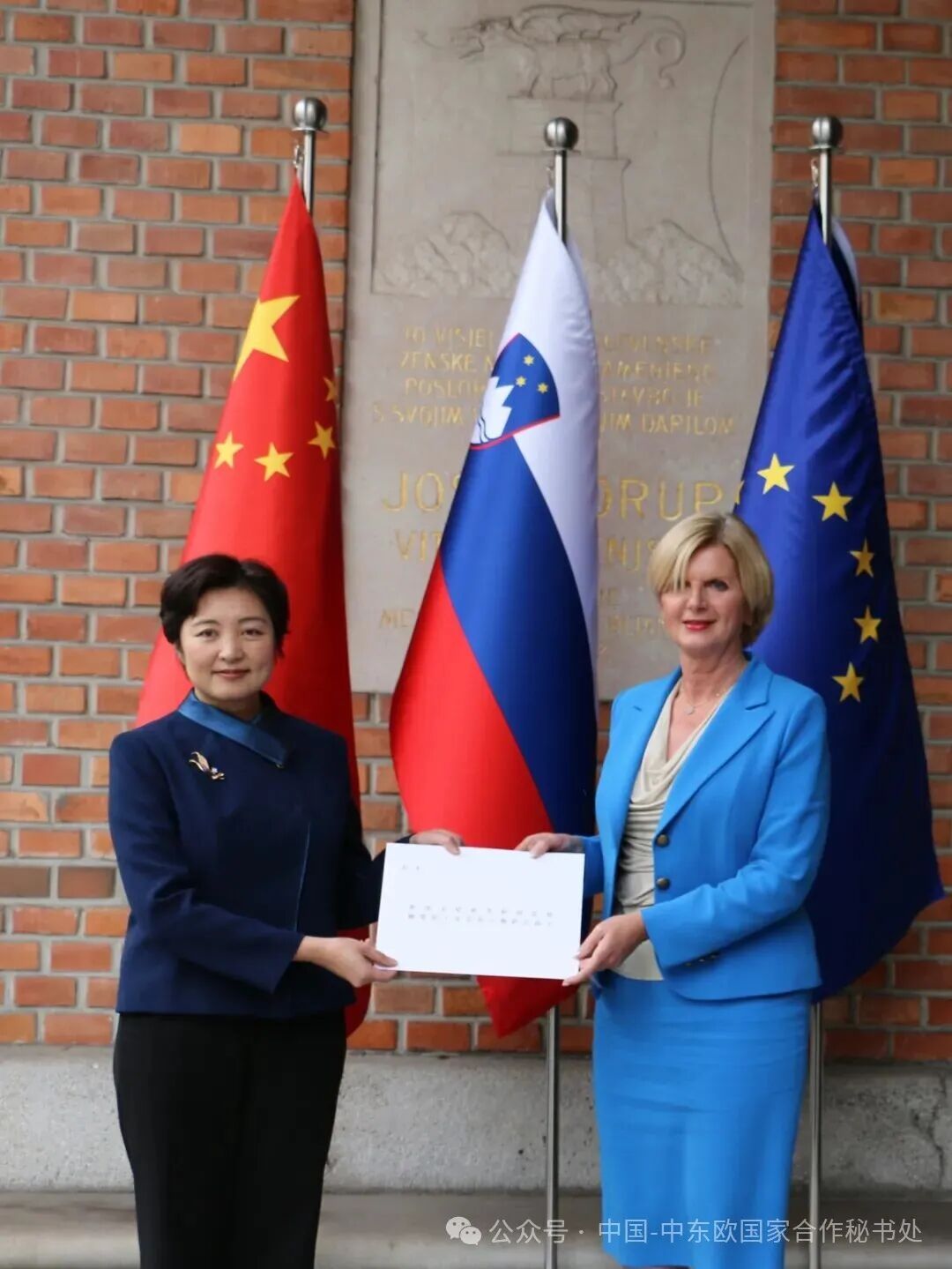 2026年1月5日,新任驻斯洛文尼亚大使康艳向斯外交与欧洲事务部礼宾司司长普拉赫递交国书副本。
